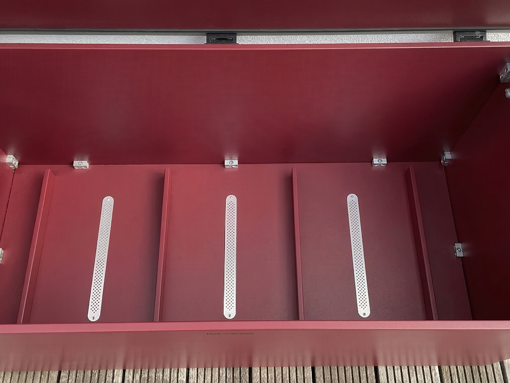 Thermische Trägheit: HPL heizt sich im Sommer nicht so extrem auf wie Metall. Ihre Mülltonnen stinken weniger, Ihre Kissenbox bleibt kühler.