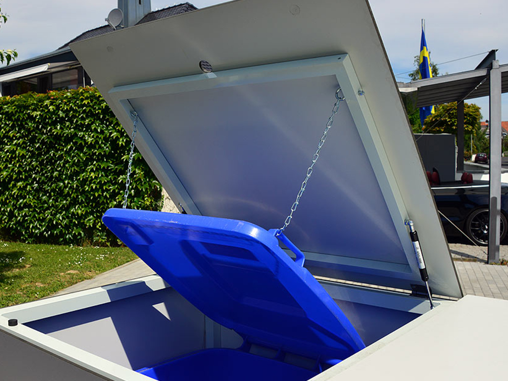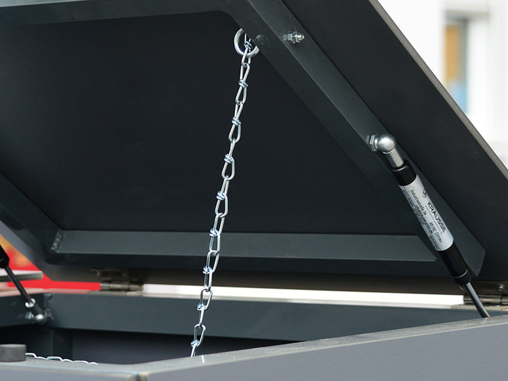 Innovative Lösungen wie integrierte Gasdruckfedern und eine Kettensicherung erleichtern Ihnen das Befüllen der Mülltonnen.